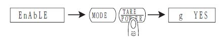 第4步 按下MODE鍵,天平顯示“g yes”,表示單位克可以使用,再按MODE鍵確認(rèn)。如不需以克為單位稱量,請(qǐng)按TARE鍵,天平會(huì)顯示“g no”,再按MODE鍵確認(rèn)。用同樣方法可以對(duì)“盎司(oz)”和“克拉(ct)”進(jìn)行稱量模式設(shè)置。