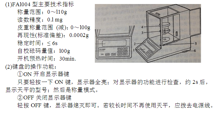 FAl004型電子天平外形結(jié)構(gòu)如圖所示。1一鍵盤(控制板);2一顯示器;3一盤托;4一稱盤; 5一水平儀; 6一水平調(diào)節(jié)腳