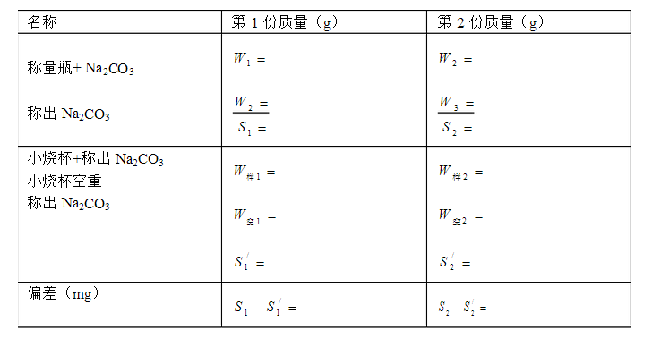 記錄1W;從其中移取約0.3~0.4g(1/3左右)于**個小燒杯中后,精確稱量剩余質(zhì)量,記錄2W;從中再移取約0.3~0.4g于第二個小燒杯中,精確稱量剩余質(zhì)量,記錄3W。 3. 再分別稱量已裝有Na2CO3樣品的小燒杯的質(zhì)量,記錄1樣W和2樣W。 4. 結(jié)果的檢驗(yàn)